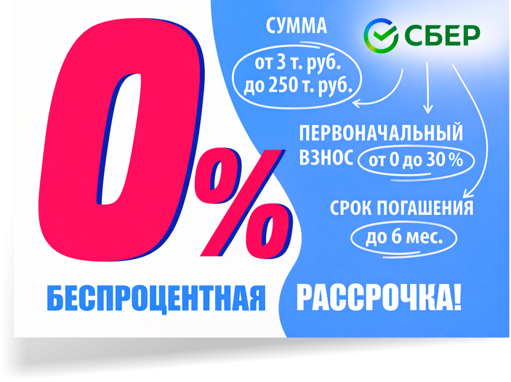 При оформлении рассрочки от Сбербанка в офисе компании стоимость покупки разделяется на равные части без переплаты.